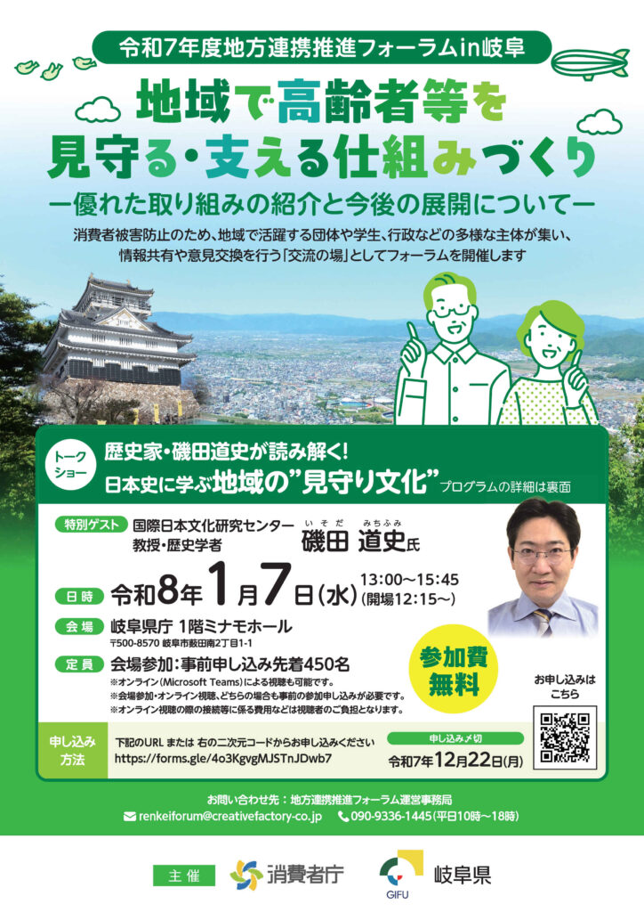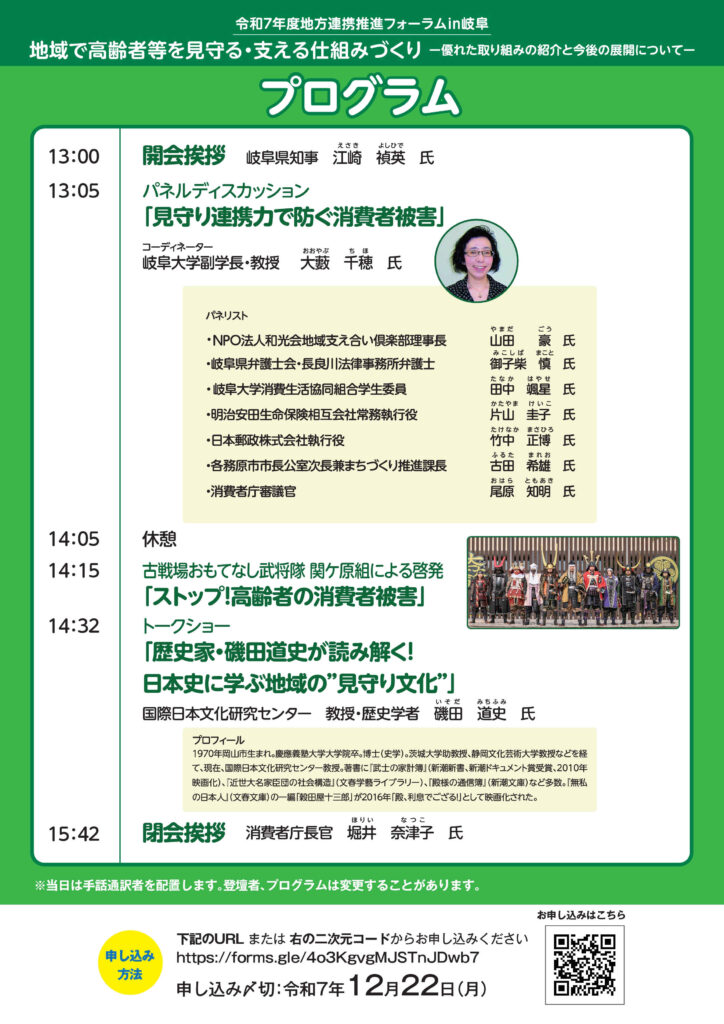 消費者被害から高齢者や障がい者を地域で見守る・支える仕組みづくりについて、多様な主体が集い、交流する場であり、歴史学者の磯田道史氏のトークショー、古戦場おもてなし武将隊、関ケ原組による啓発も実施します。