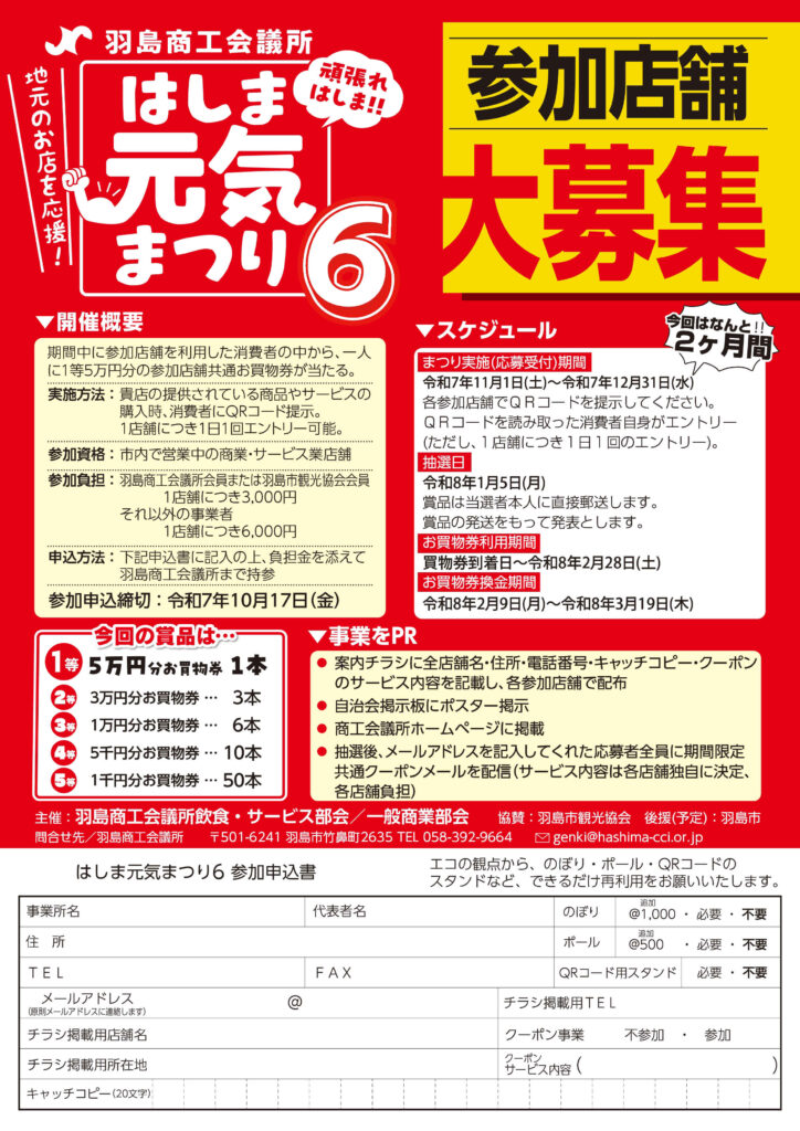参加を希望する事業所は、「はしま元気まつり6 参加申込書」に必要事項を記入して、参加負担金を添えて商工会議所事務局へ申込み。