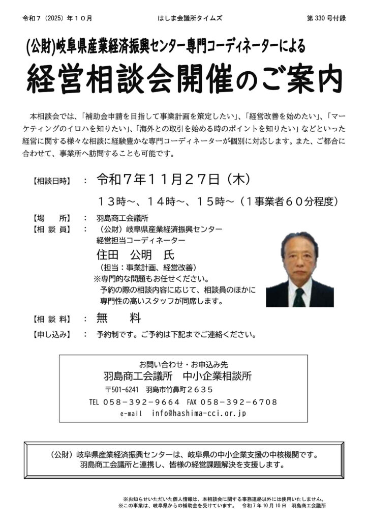 R7.11.27(公財)岐阜県産業経済振興センター専門コーディネーターによる経営相談会のご案内